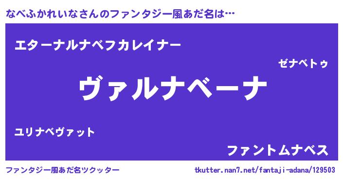 | 男性向けラノベタイトル風あだ名 | 『魔弾の王となべふかれいな』 |