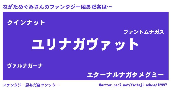 | 男性向けラノベタイトル風あだ名 | 『ながためぐみ~年齢イコール彼女いない歴の魔法使い~』 |