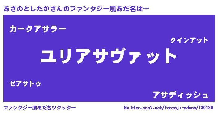 | 男性向けラノベタイトル風あだ名 | 『あさのとしたか~年齢イコール彼女いない歴の魔法使い~』 |