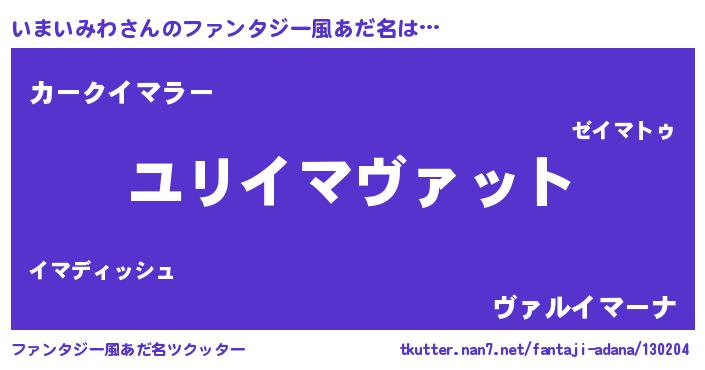 | 男性向けラノベタイトル風あだ名 | 『いまいみわ~年齢イコール彼女いない歴の魔法使い~』 |