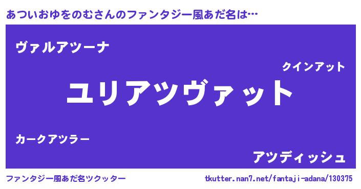 | 男性向けラノベタイトル風あだ名 | 『あついおゆをのむ~年齢イコール彼女いない歴の魔法使い~』 |