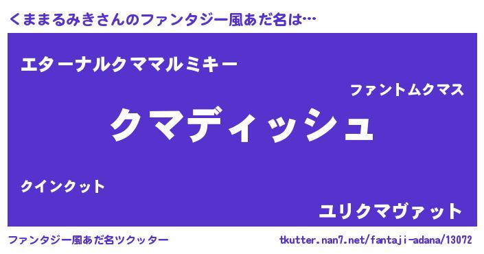 | 胡散臭い通販商品みたいなあだ名 | 『絶対に幸福をもたらす水素水…その名も「くままるみき」』 |