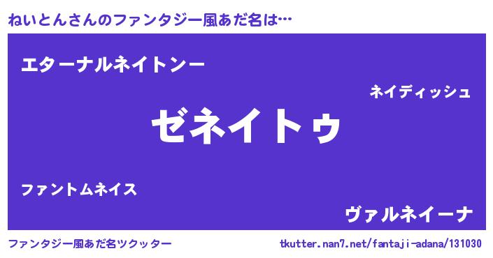 | 男性向けラノベタイトル風あだ名 | 『Re:ねいとんから始める異世界生活』 |