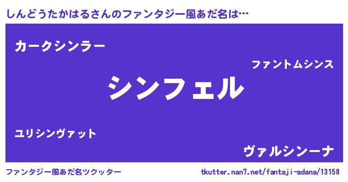 | 男性向けラノベタイトル風あだ名 | 『シンドウタカハルアートオンライン』 |