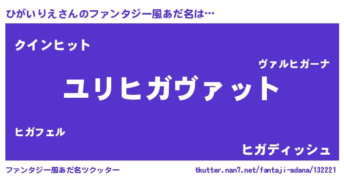 | 男性向けラノベタイトル風あだ名 | 『ひがいりえ~年齢イコール彼女いない歴の魔法使い~』 |