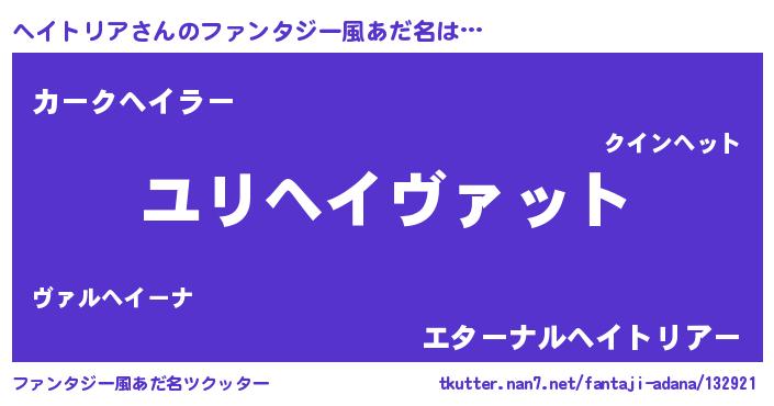 | 男性向けラノベタイトル風あだ名 | 『ヘイトリア~年齢イコール彼女いない歴の魔法使い~』 |