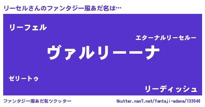 | 男性向けラノベタイトル風あだ名 | 『この素晴らしい世界にリーセルを!』 |