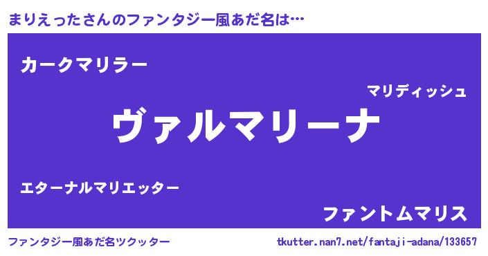 | 男性向けラノベタイトル風あだ名 | 『魔弾の王とまりえった』 |