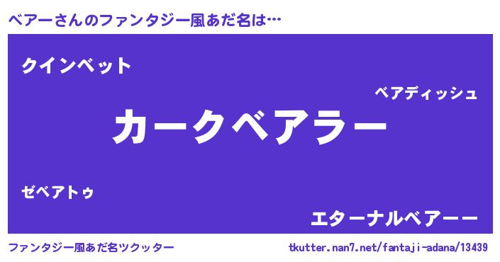 | 男性向けラノベタイトル風あだ名 | 『ベアーに滅ぼされるだけの簡単なお仕事です』 |