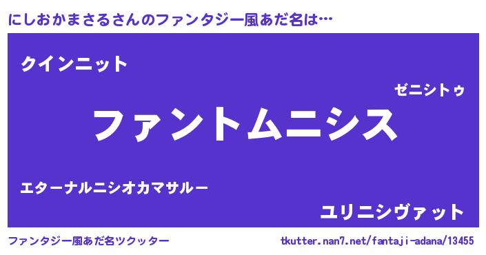 | 男性向けラノベタイトル風あだ名 | 『にしおかまさるの嫁は女の子じゃないと思った?』 |