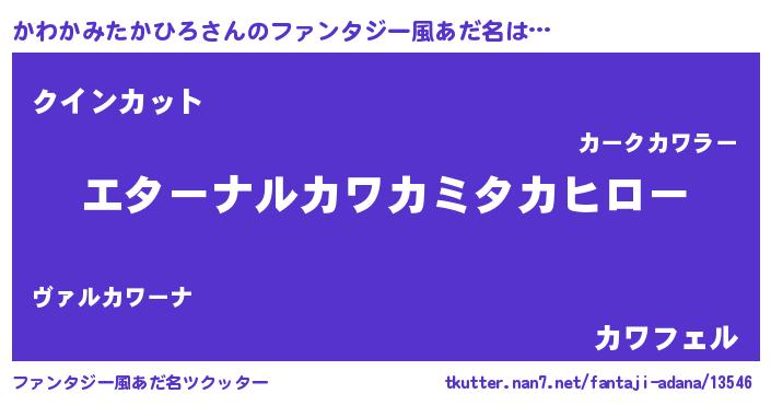 | 男性向けラノベタイトル風あだ名 | 『やはりかわかみたかひろの青春ラブコメはまちがっている 』 |