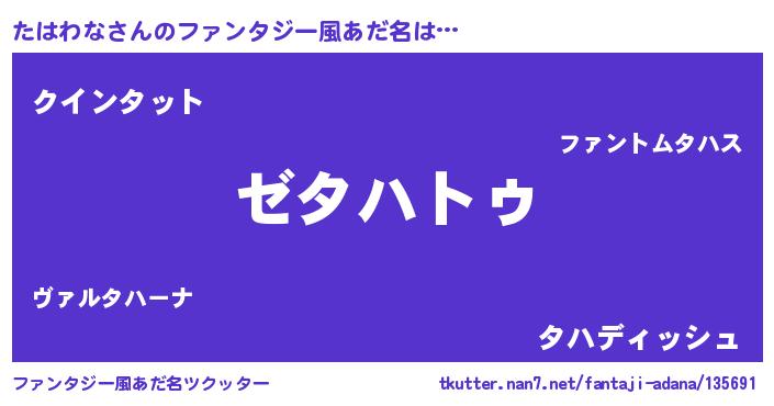 | 男性向けラノベタイトル風あだ名 | 『Re:たはわなから始める異世界生活』 |