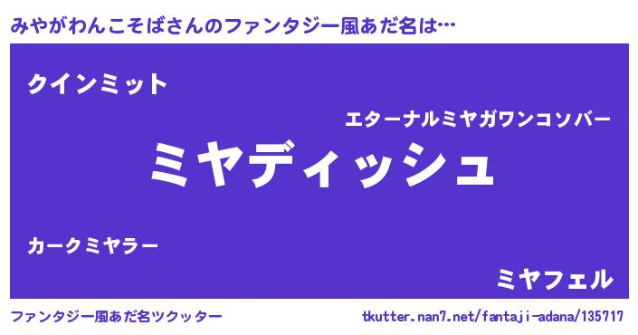 | 男性向けラノベタイトル風あだ名 | 『はたらくみやがわんこそばさま!』 |