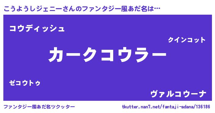 | 男性向けラノベタイトル風あだ名 | 『うちのこうようしジェニーが世界を掌握している!』 |