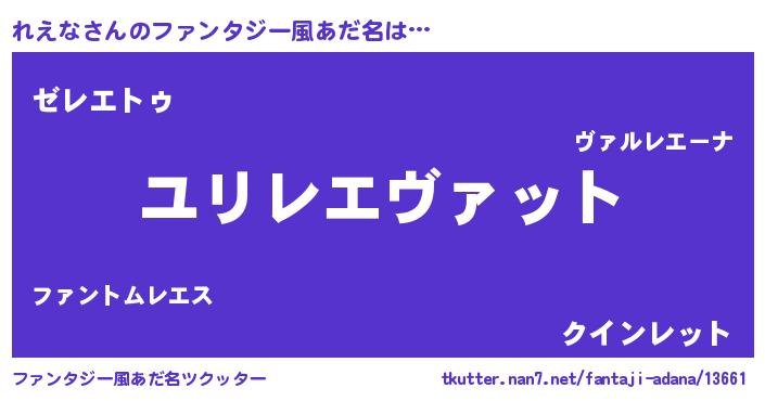 | 男性向けラノベタイトル風あだ名 | 『レエナスレイヤー』『魔弾の王とれえな』 |