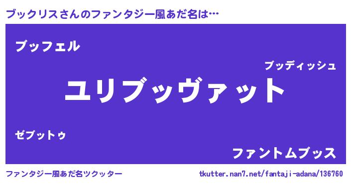 | 男性向けラノベタイトル風あだ名 | 『ブックリス~年齢イコール彼女いない歴の魔法使い~』 |