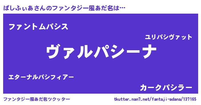 | 男性向けラノベタイトル風あだ名 | 『魔弾の王とぱしふぃあ』 |