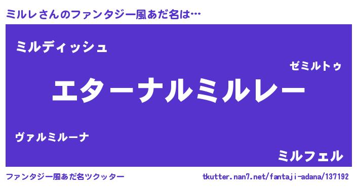 | 男性向けラノベタイトル風あだ名 | 『はたらくミルレさま!』『ミルレの憂鬱』 |