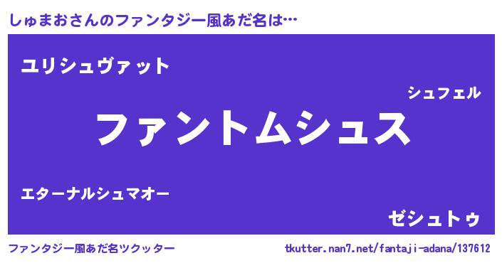 | 男性向けラノベタイトル風あだ名 | 『ダンジョンにしゅまおを求めるのは間違っているだろうか』 |