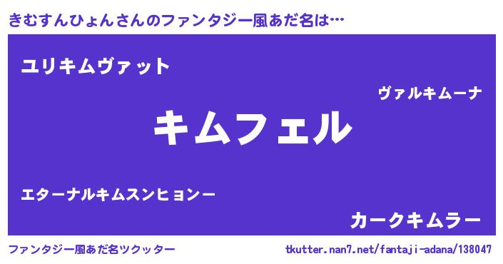 | 女子向けラノベタイトル風あだ名 | 『(仮)きむすんひょんのやんごとなき事情』 |