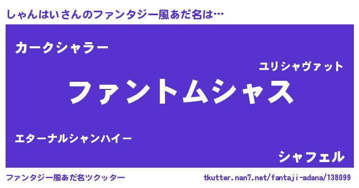 | 男性向けラノベタイトル風あだ名 | 『しゃんはいの嫁は女の子じゃないと思った?』 |