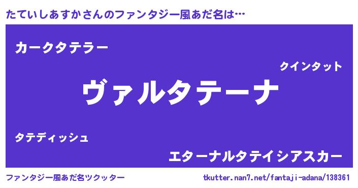 | 男性向けラノベタイトル風あだ名 | 『魔弾の王とたていしあすか』 |