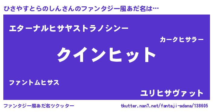 | 男性向けラノベタイトル風あだ名 | 『おまえをオタクにしてやるから、俺をひさやすとらのしんにしてくれ! 』 |
