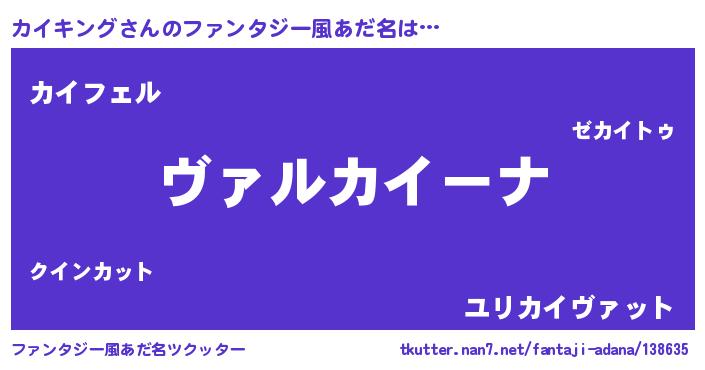 | 男性向けラノベタイトル風あだ名 | 『この素晴らしい世界にカイキングを!』 |