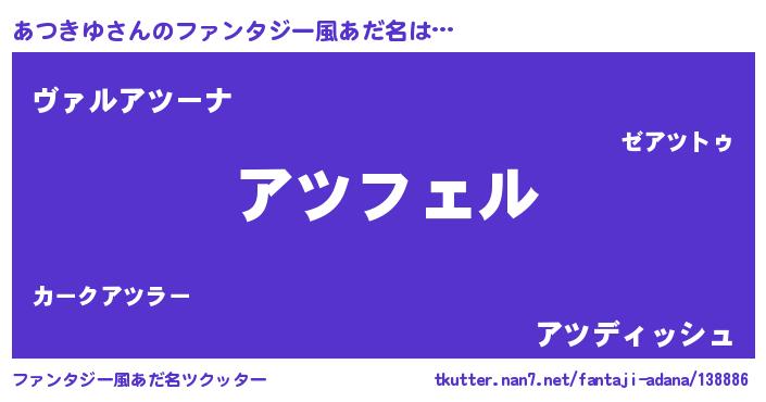 | 男性向けラノベタイトル風あだ名 | 『あつきゆの憂鬱』『魔弾の王とあつきゆ』 |