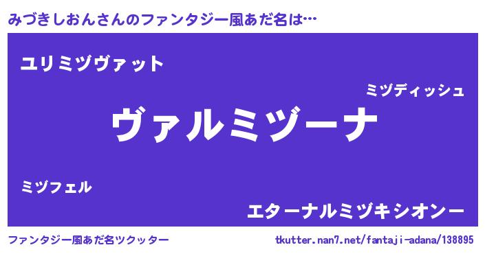 | 男性向けラノベタイトル風あだ名 | 『魔弾の王とみづきしおん』 |
