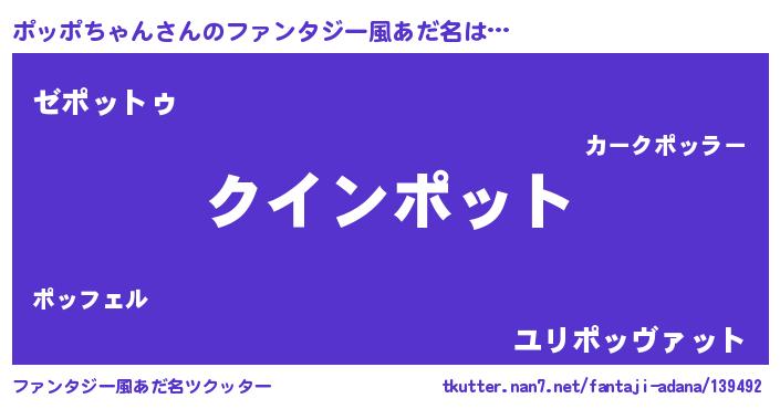 | 男性向けラノベタイトル風あだ名 | 『おまえをオタクにしてやるから、俺をポッポちゃんにしてくれ! 』 |
