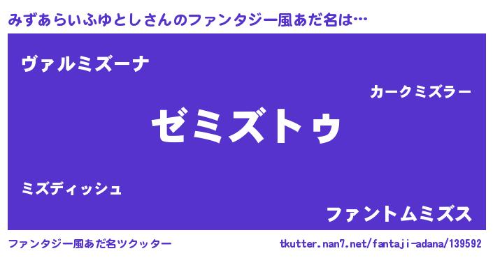 | 男性向けラノベタイトル風あだ名 | 『Re:みずあらいふゆとしから始める異世界生活』 |