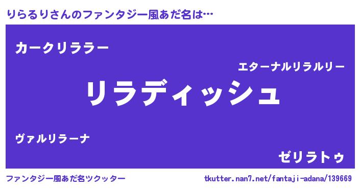 | 女子向けラノベタイトル風あだ名 | 『りらるりの契約王妃』『闇のりらるり』 |