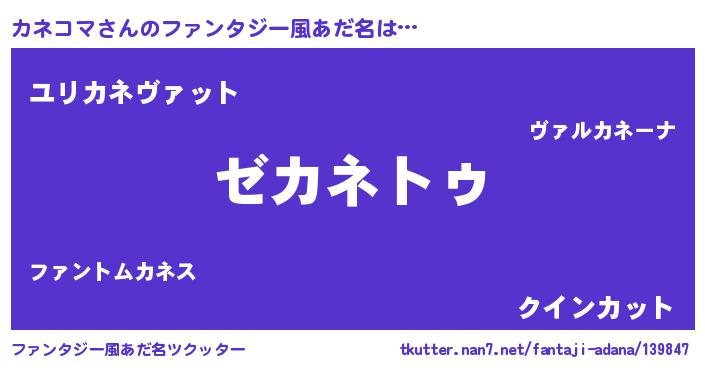 | 男性向けラノベタイトル風あだ名 | 『Re:カネコマから始める異世界生活』 |