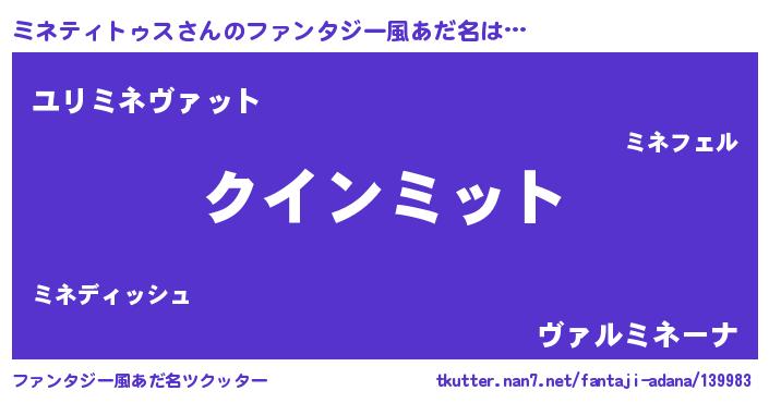 | 男性向けラノベタイトル風あだ名 | 『おまえをオタクにしてやるから、俺をミネティトゥスにしてくれ! 』 |