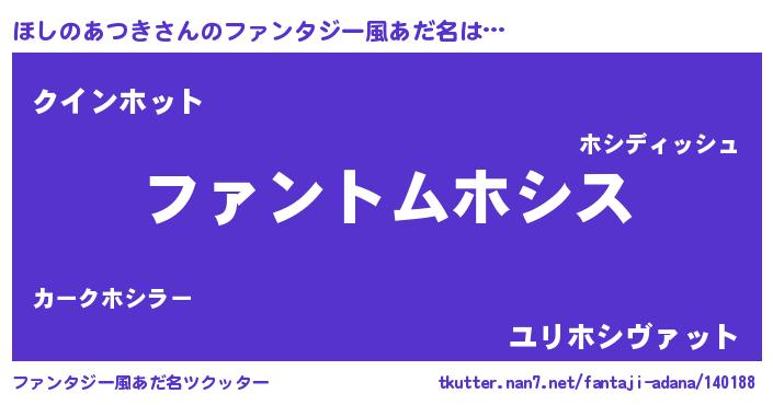 | 男性向けラノベタイトル風あだ名 | 『ほしのあつきの嫁は女の子じゃないと思った?』 |