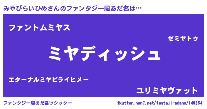 | ヘコむあだ名 | 『みやびらいひめ(苦笑)』『みやっちょ』 |