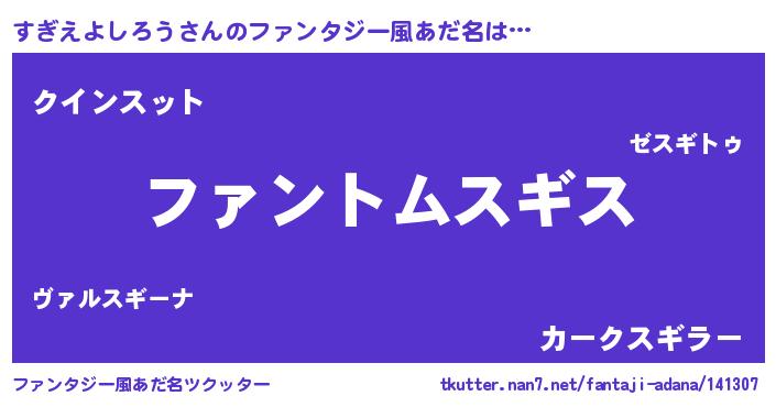 | 男性向けラノベタイトル風あだ名 | 『すぎえよしろうの嫁は女の子じゃないと思った?』 |
