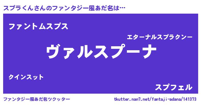 | 男性向けラノベタイトル風あだ名 | 『魔弾の王とスプラくん』 |