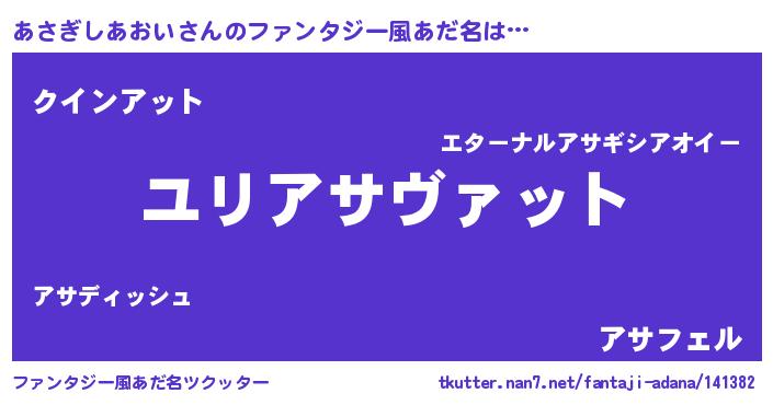 | 男性向けラノベタイトル風あだ名 | 『あさぎしあおい~年齢イコール彼女いない歴の魔法使い~』 |