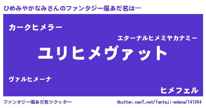| 男性向けラノベタイトル風あだ名 | 『ひめみやかなみ~年齢イコール彼女いない歴の魔法使い~』 |