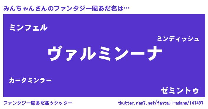 | 男性向けラノベタイトル風あだ名 | 『魔弾の王とみんちゃん』 |