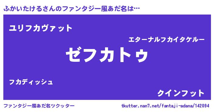 | 男性向けラノベタイトル風あだ名 | 『Re:ふかいたけるから始める異世界生活』 |