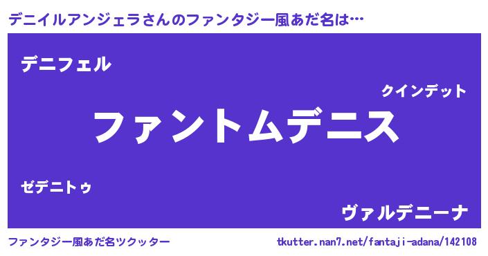 | 男性向けラノベタイトル風あだ名 | 『デニイルアンジェラの嫁は女の子じゃないと思った?』 |