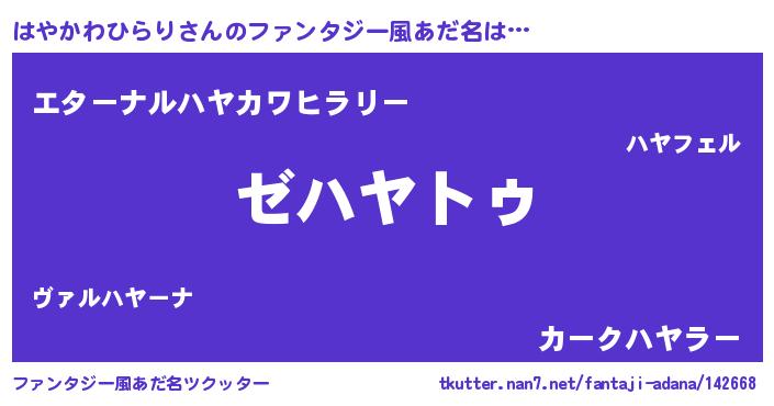 | 男性向けラノベタイトル風あだ名 | 『Re:はやかわひらりから始める異世界生活』 |