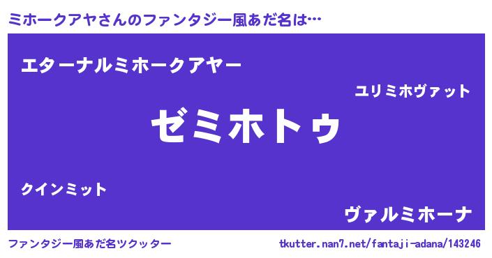 | 女子向けラノベタイトル風あだ名 | 『ミホークアヤアンティーク』 |