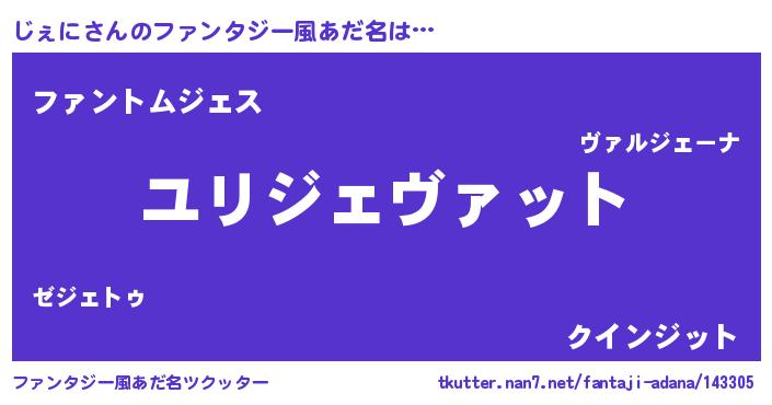 | 女子向けラノベタイトル風あだ名 | 『じぇにの玉の輿計画!』 |