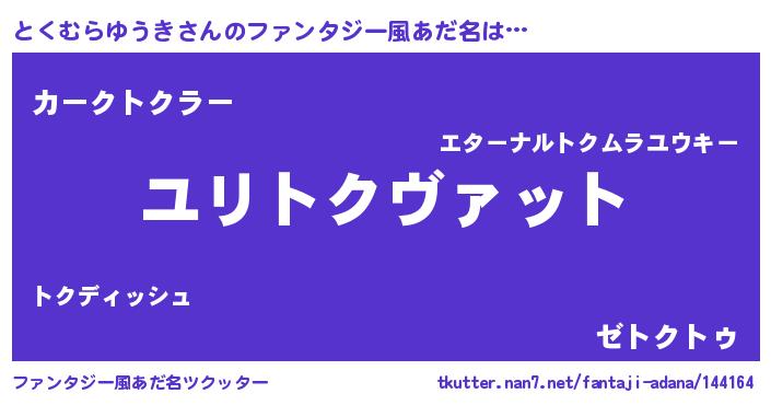 | 男性向けラノベタイトル風あだ名 | 『とくむらゆうき~年齢イコール彼女いない歴の魔法使い~』 |