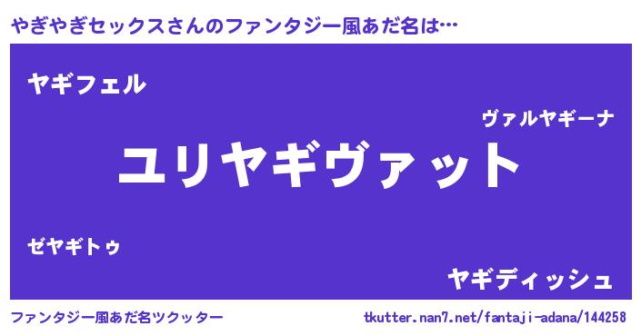 | 男性向けラノベタイトル風あだ名 | 『ヤギヤギセックススレイヤー』 |