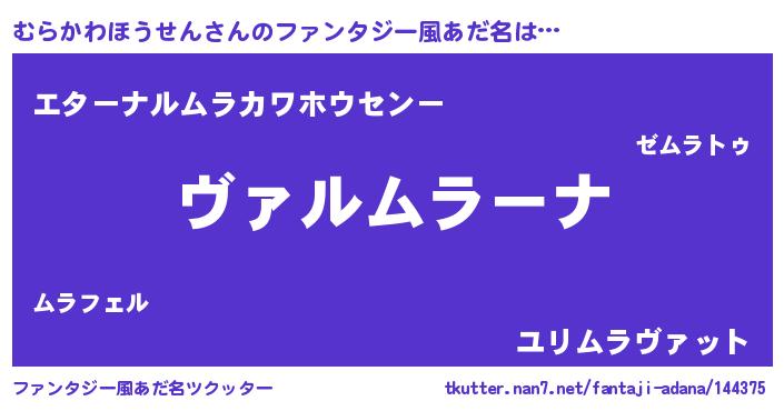 | 男性向けラノベタイトル風あだ名 | 『この素晴らしい世界にむらかわほうせんを!』 |